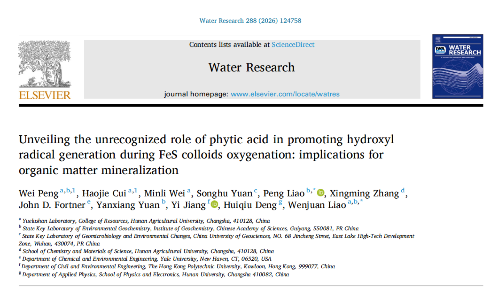 近日,我院崔浩杰教授团队与中国科学院地球化学研究所廖鹏研究员合作,在模拟稻田湿地环境中有机磷对铁硫氧化影响作用机制及其耦合有机碳转化方面取得进展,研究结果以Unveiling the unrecognized role of phytic acid in promoting hydroxyl radical generation during FeS colloids oxygenation: implications for organic matter mineralization为题发表在环境领域顶级期刊Water Research上。