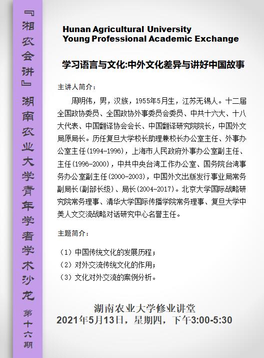 湖南农业大学青年学者学术沙龙第十六期--学习语言与文化:中外文化差异与讲好中国故事